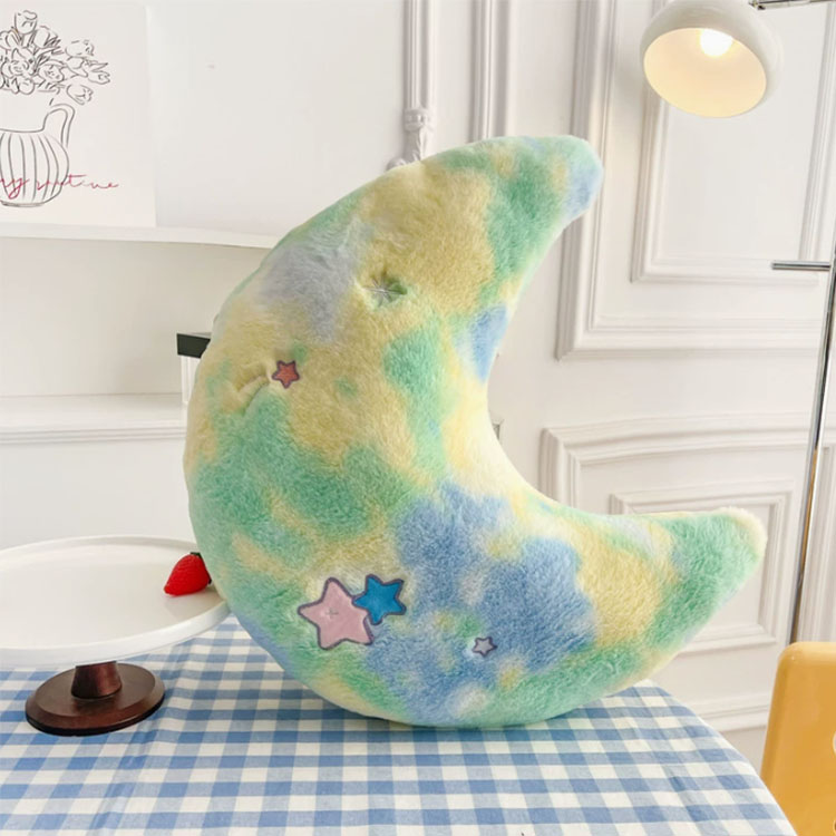 The biggest highlight of this moon-shaped pillow is that the fabrics are all tie-dyed, not just solid colors. For example, a green surface is accented with yellow and blue, while a blue surface is accented with white and purple, and so on. This makes it truly eye-catching.