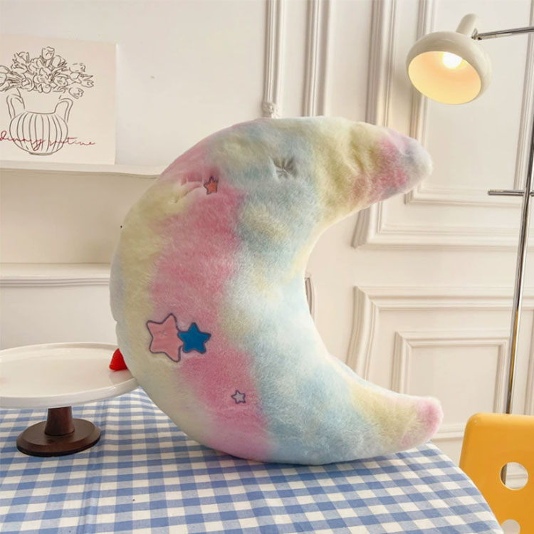 This Adorable Moon shaped Pillow has a classic moon shape. It looks full and nice. Both adults and kids love it.The surface is soft short plush. It is smooth and does not shed or fade easily. You can hug it comfortably.We use high-elastic PP cotton inside. The filling is full. It rebounds fast and supports well. It is soft enough for sleeping.The pillow is 50cm high. Colors include pink, yellow, blue, and green.